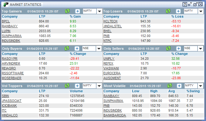 Market Statistics feature displays you several key parameters to help you evaluate the market trends present during the day. These parameters include Top Gainers, Top Losers, Volume Toppers, Most Volatile Scrips, etc.