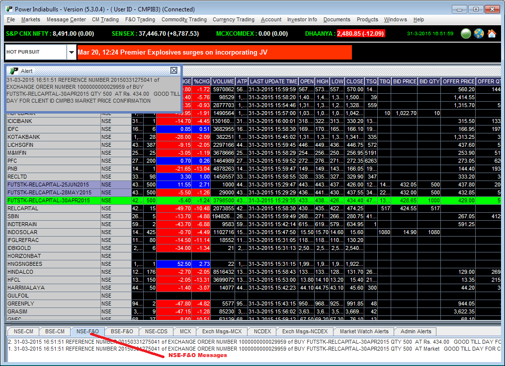 NSE-CM feature displays you messages, which are sent by NSE in response to your orders and trades related activities carried on it. You can view these messages under NSE-CM tab in Message Center Panel.