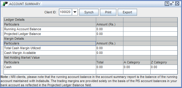 Account Summary Report displays a summary of your Indiabulls account. Here, you can view your ledger balances, margin details (Available and Utilized), current market value of your holdings in 'A' category stocks & 'Z' category stocks and maximum amount that you can withdraw from your Indiabulls Trading account.