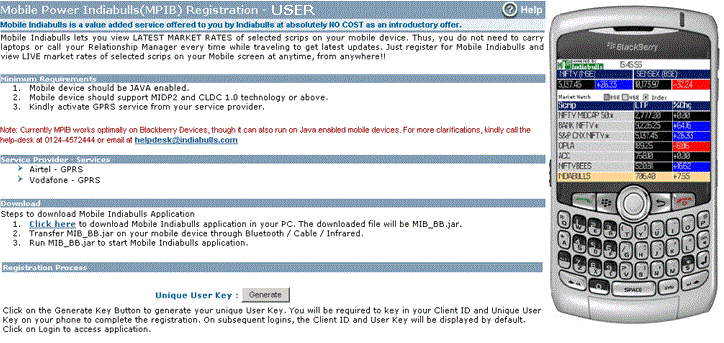 - To activate MPIB, you need to first generate the User Key. In regard to this, you need to first login to your trading account online and click on 'Mobile Indiabulls' option given under 'Products' menu. Note! Offline clients can directly click on MPIB option given in their online account.