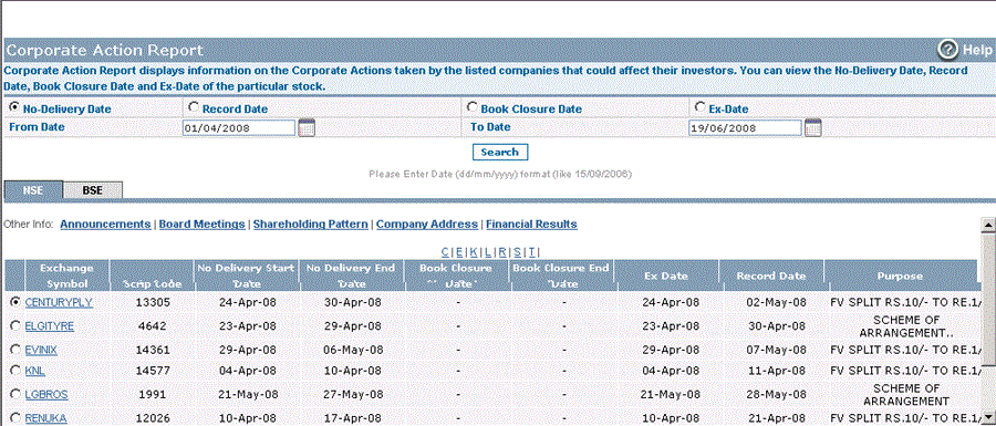 To begin with, select the Corporate Action that you would like to view. The options available are No-Delivery Date, Record Date, Book Closure Date and Ex-Date.