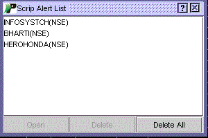 Note! In case you have set multiple alerts on the particular scrip and wish to delete only the specific alert(s), select the scrip and click on 'Open' button to open Alert Box (displayed above). Now, click on 'Delete' button to delete the corresponding alert. Also Read: | |||