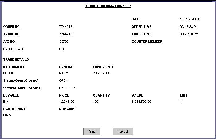 Action – User can also take the print out of the trade report by clicking on ‘PRINT’ button. On clicking, you will view the Trade Confirmation