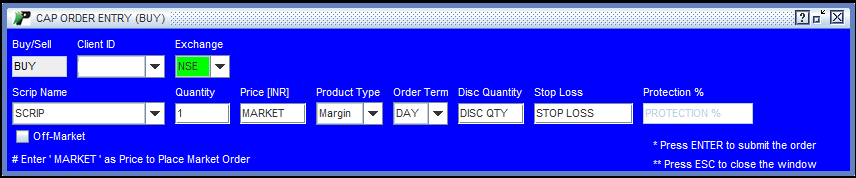 Buy option lets you buy scrips in Capital Market segment. Alternatively, you can also access this feature from Market Watch by right-clicking on the scrip and selecting 'Buy Now' option. Note! You can also press 'F11' key on your keyboard to place a buy order in the Capital Market.