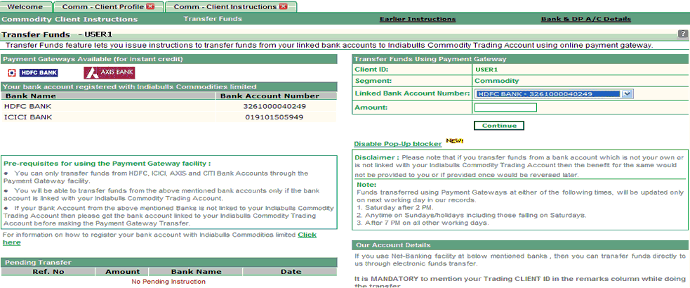 You can click on this link to transfer funds from your Bank Account to your Indiabulls Commodities Account using Bank Payment Gateways. The system provides you instant credit in your trading account on successful transfer of funds. To know more about Transfer Funds feature, click here...