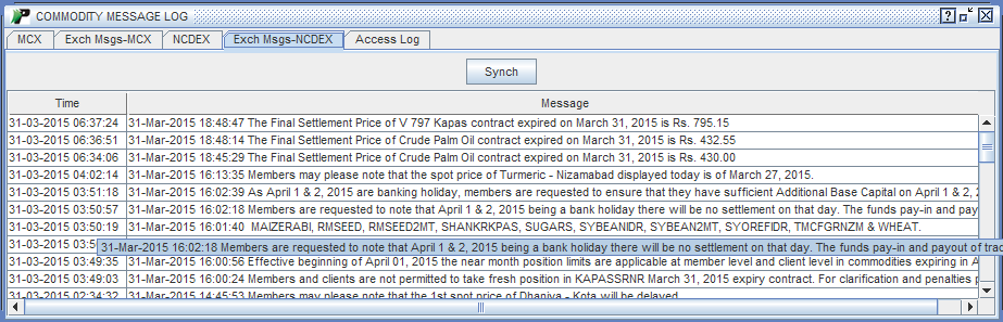 The details displayed in this tab include: MCXMCX tab displays messages sent by MCX pertaining to orders and trades executed in your trading account. Exch Msgs - MCX Exch Msgs - MCX displays general messages sent by MCX pertaining to Parity Price, Circuit Limits revision, etc. NCDEX NCDEX tab displays messages sent by NCDEX pertaining to orders and trades executed in your trading account. Exch Msgs - NCDEX Exch Msgs - NCDEX displays general messages sent by NCDEX pertaining to Parity Price, Circuit Limits revision, etc. Access Log Access Log tab provides you login related information. The details displayed in this section includes: