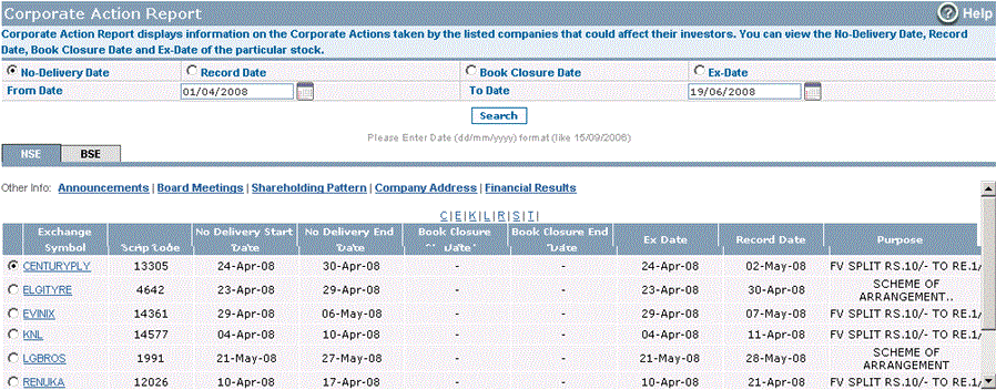 Corporate Action Report provides information on various Corporate Actions taken by companies during the year that could affect their investors. It includes Book Closure Date, No Delivery Date, Record Date and Ex-Date of the particular corporate.