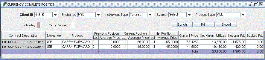 Currency Complete Position Report displays a summary of all open positions held by you in Currency Futures and Options (F&O) segment. PIB displays you the following window, when you select this option in Reports Menu: