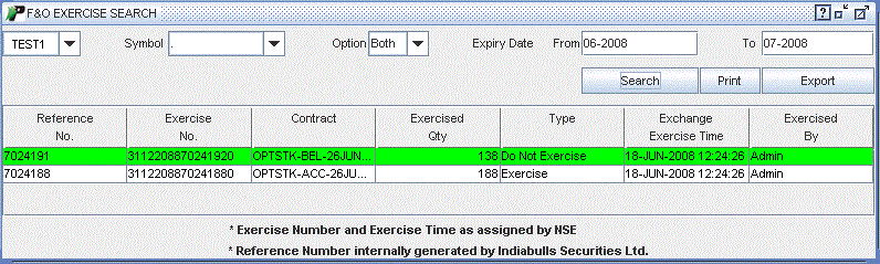 Expiry Date From / To – You can use this option to search those Options contracts which were exercised by you between the two selected dates. Specify the date after which you wish to view exercise(s) in ' From' field. Similarly, specify the date till which you wish to view exercise(s) in 'To' field. These dates will be in format (dd/mm/yyyy).