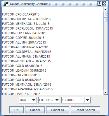 - Exchange - You may use the desired exchange (MCX, NCDEX) to view the list of underlying and the derivatives contracts available in that exchange.