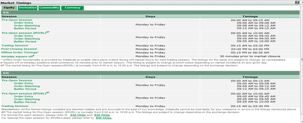 Market Timings Window provides you detailed nformation on the market timings of the exchanges like Pre-Open Session, Trading Session, Post Closing Session, Offline order timings and intraday square off along with the last updated time.