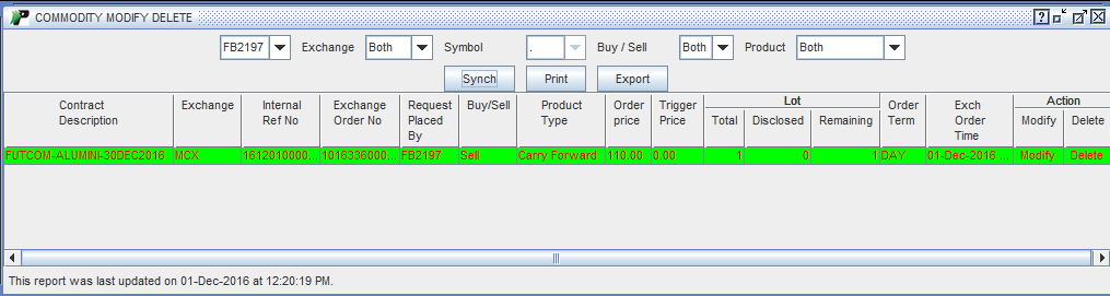 - Synch - You can click on ‘Synch’ button to synchronize /update the Commodity Outstanding Orders table.