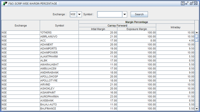 - Margin Percentage (Carry Forward) - This field will display the margin percentage blocked for taking positions in the contracts of given underlying in normal (Carry Forward).