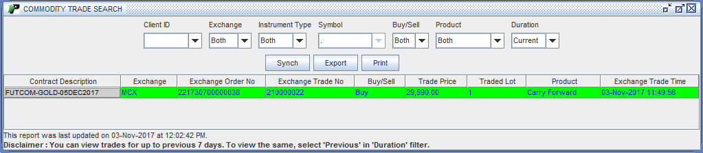 - Duration –You can view the trades on the basis of duration. To view the trades for the current day, choose option ‘Current’ and to view the trades for previous 10 days, choose ‘Previous’ option.
