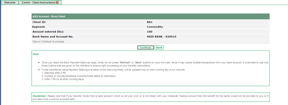 - Now, you can login into your bank account and transfer funds to Indiabulls Commodities Trading Account.