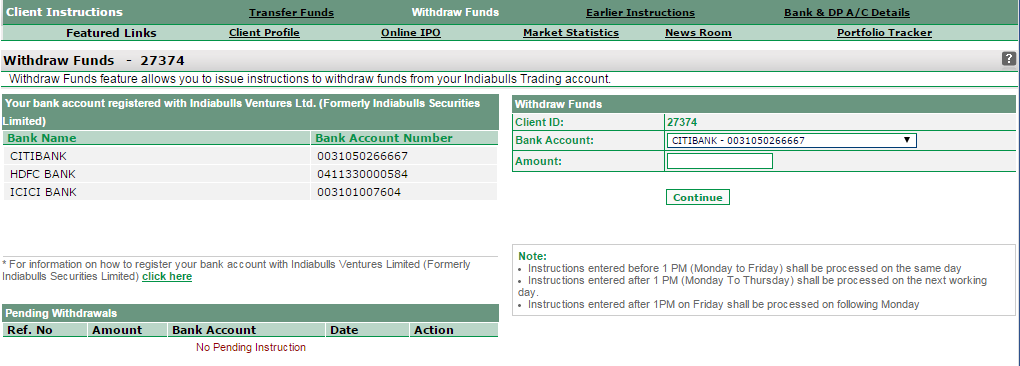 Note! All the bank accounts that are currently linked with your Indiabulls Trading Account are displayed in the section "Your Bank Account registered with Indiabulls Ventures Ltd. (Formerly Indiabulls Securities Limited)" (Kindly refer to the first screenshot above).
